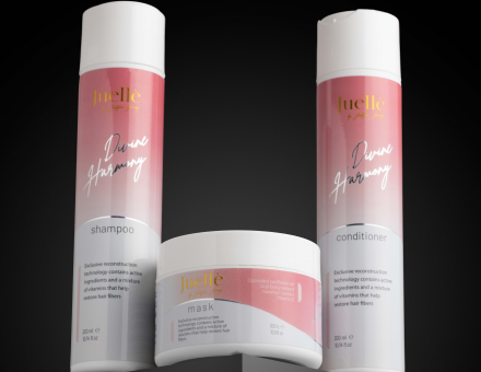 Linia Divine Harmony marki JUELLE to wyjątkowe rozwiązanie, które zapewnia harmonię nawilżenia i regeneracji włosów. Opracowana w oparciu o ekskluzywną formułę technologii rekonstrukcyjnej, ta gama produktów wykorzystuje moc oleju kokosowego, masła z nasion Murumuru, witaminy E oraz ekstraktu z aloesu. Odkryj moc harmonijnej pielęgnacji z JUELLE!