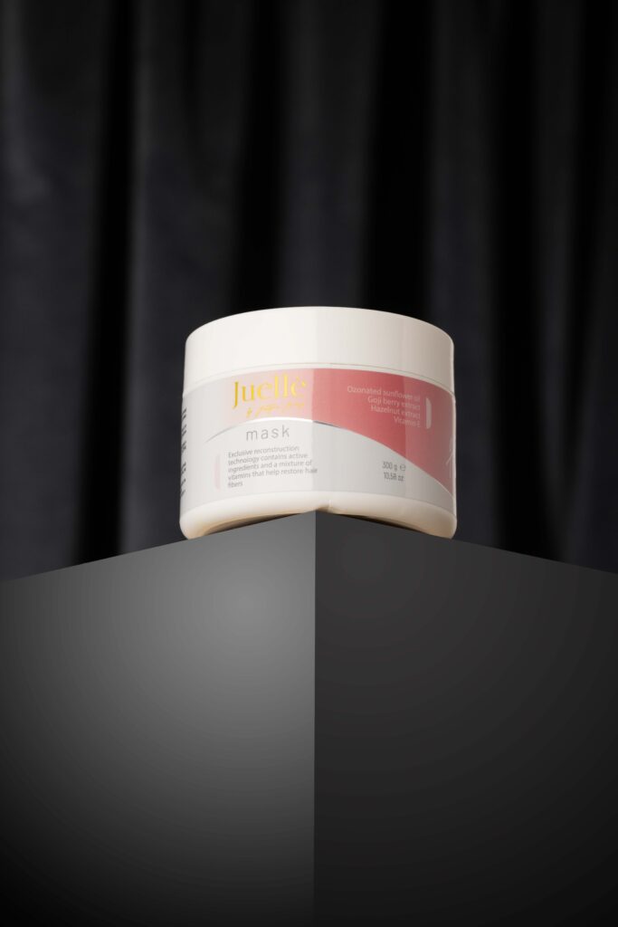 Maska Divine Harmony od JUELLE by Justyne Janisz została opracowana w oparciu o ekskluzywną formułę technologii rekonstrukcyjnej na bazie oleju kokosowego, masła karite, ozonowanego oleju z nasion słonecznika, oleju arganowego, witaminy i ekstraktu z owoców goji, które pomagają odbudować włókna włosów.